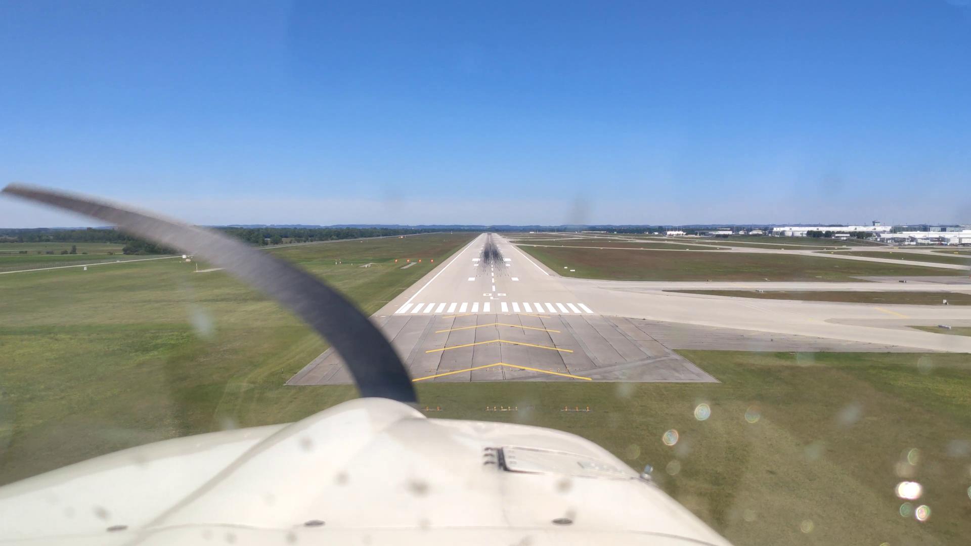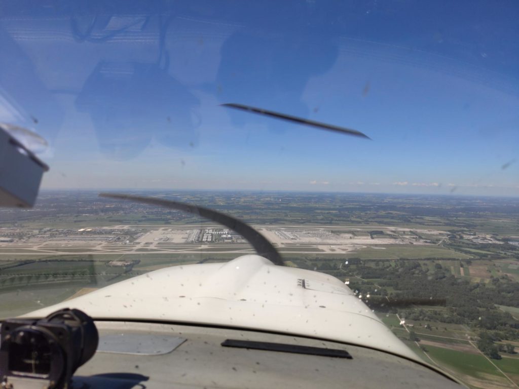 Nach dem Start in Thannhausen ging es nach Osten in Richtung München. Der Flug führte über Haunstetten, weiter nach Dachau, über Allach, vorbei am Olympiazentrum und über Ismaning weiter in Richtung Norden zum Flughafen. Dort war nur wenige Betrieb und so erhielt die Crew die Freigabe das Flughafengelände mittig von Süd nach Nord zu überfliegen (Midfield Crossing) und für einen Low Approach auf die Nordbahn 08L. Je näher das Motorflugzeug dem Flughafen mit seinen beiden großen Landebahnen kommt, desto eindrucksvoller wird die immense Größe. Zuhause in Thannhausen wird von einer 500 Metern langen und 30 Meter breiten Grasbahn gestartet und gelandet. Auch in Augsburg sind die Piloten öfter zu Besuch, mit einer deutlich längeren asphaltieren Piste von 1594 Metern Länge. Doch beides ist kein Vergleich zu den beiden 4000 Meter langen und 60 Meter breiten Start-/Landebahnen in München. Beim Anflug auf die Bahn kann so der Eindruck entstehen man fliege noch viel zu hoch. Der Queranflug führte entlang der A92 zu einem relativ kurzem Endanflug. Vorsichtig tastet sich Moritz mit der G115 nach unten und folgt in einigen Metern Höhe der langen Bahn. Auch mit rund 70 kt (130 km/h) fühlt sich das entlangfliegen der 4 km langen Bahn wie eine Ewigkeit an.