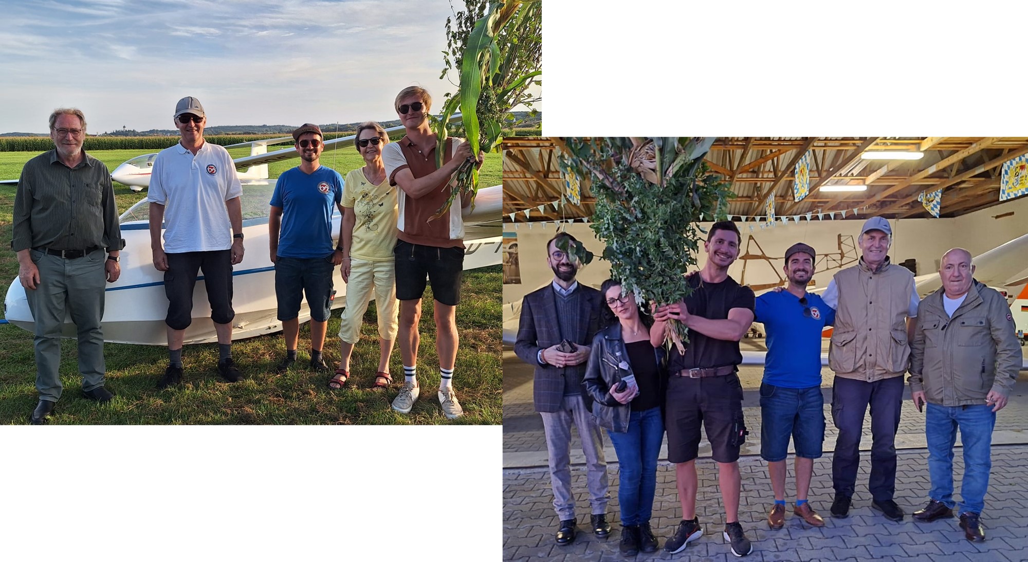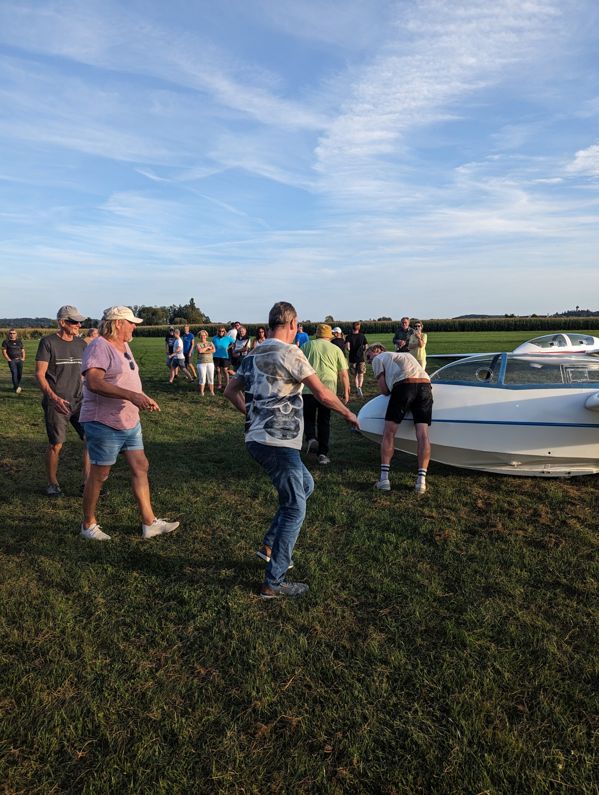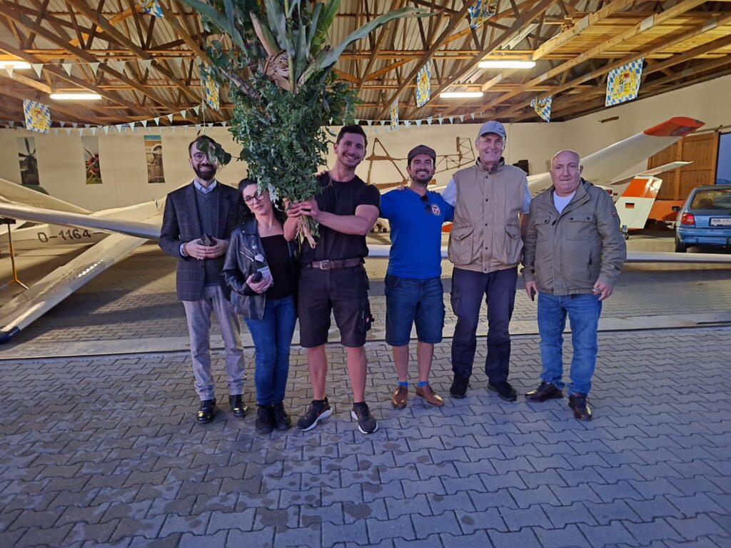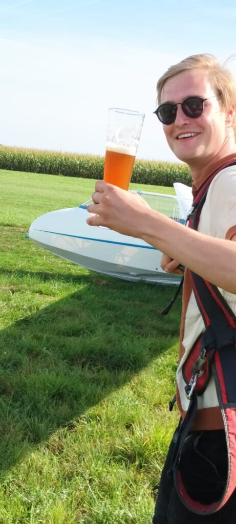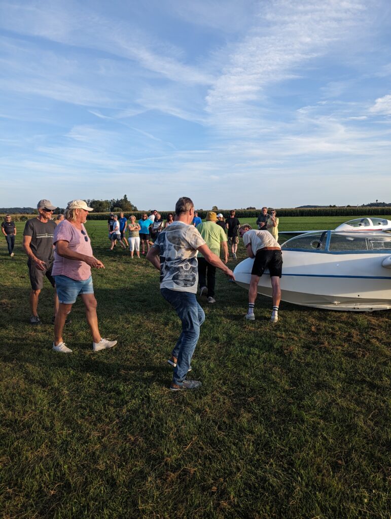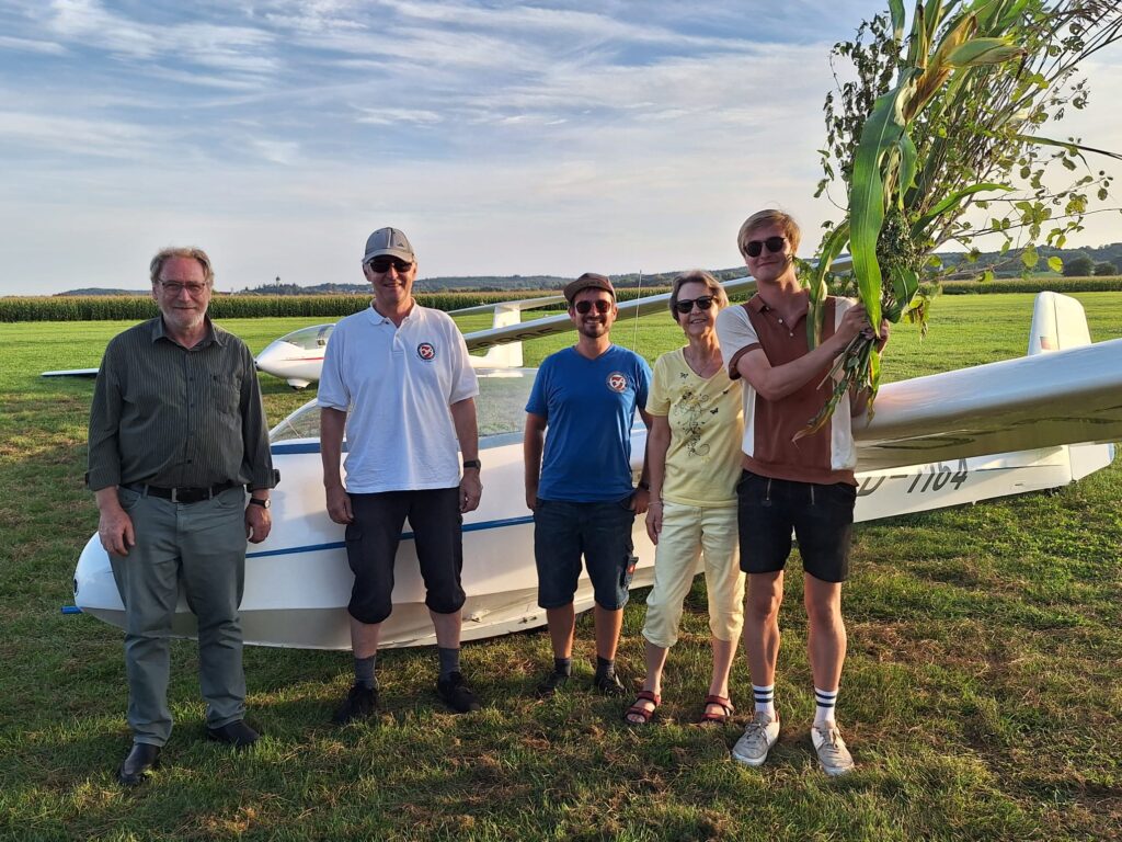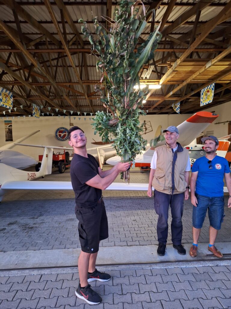 Die „Pausen“ wurden genutzt für Ausbildungsflüge und so war es am Sonntag für Marc so weit. Die Fluglehrer Josef und Thommy gaben grünes Licht für den ersten Alleinflug. Der Student aus Hochwang/Ichenhausen hatte im Mai seine Flugausbildung begonnen und nachdem zuletzt nur noch die Untersuchung zur fliegerärztlichen Tauglichkeit gefehlt hatte, war nun auch formal alles vorbereitet. Dass es plötzlich nicht nur ungewohnt ruhig ist, sondern auch rund 80kg weniger im Flugzeug sitzen ist erstmal ungewohnt. So machte Marc bei der erste Solo-Landung mit unserem Bergfalke 3 noch ein paar extra Hüpfer, danach hat es dann besser funktioniert und beim 3. Flug legte er eine einwandfreie Landung hin. Die anderen Flugschüler und Fliegerkameraden erwarteten ihn bereits und gratulierten Marc einschließlich frischem Weißbier. Zur Alleinflug-Zeremonie gehört neben einem Blumenstrauß aus Flugplatzgewächs, auch ein Klaps auf den Hintern von allen Anwesenden um das „Popometer zu kalibrieren“ für künftige Thermikflüge. Da hatte Marc etwas Pech, denn es waren noch zahlreiche Radelspaßgäste vor Ort, die beim Kalibrieren unterstützten. 😉