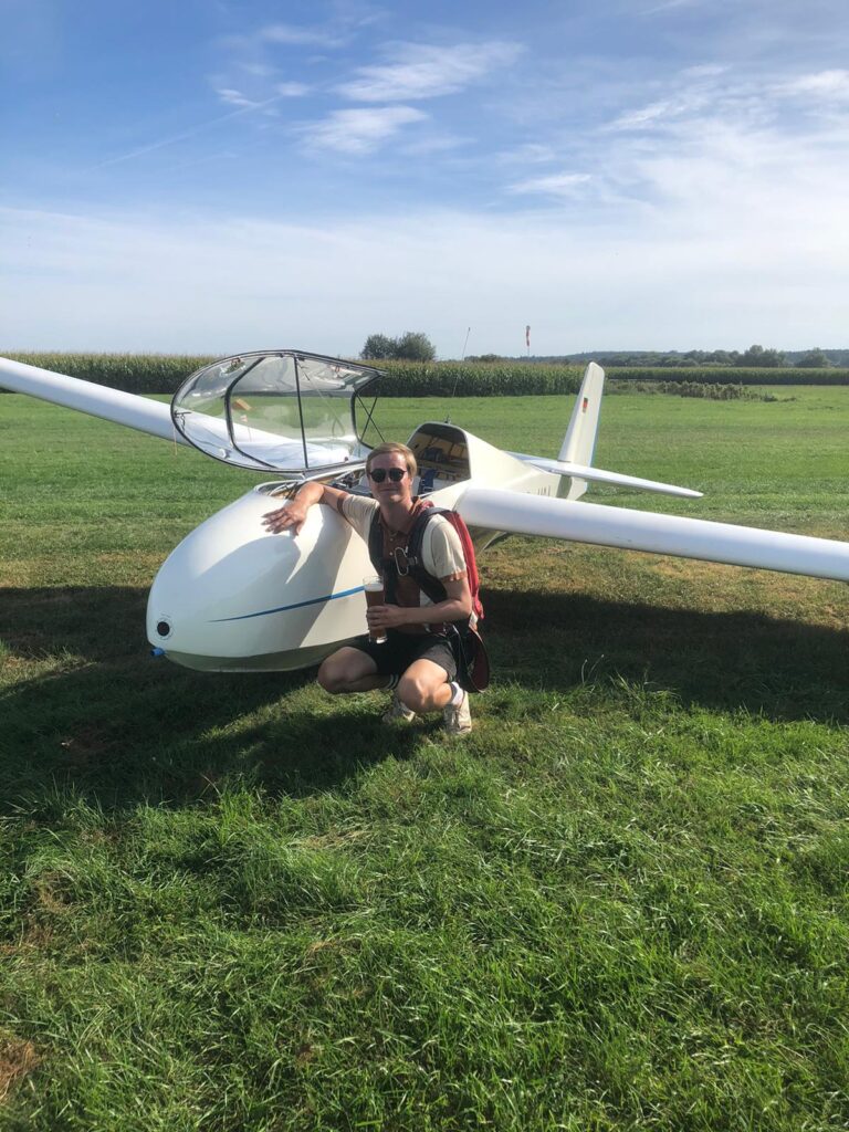 Zu guter Letzt war der vergangene Sonntag auch für Flugschüler Josef etwas Besonderes. Nach langem Warten und vielen Tagen mit nur schwacher Blauthermik, war am Sonntag gute Wolkenthermik prognostiziert. Vielleicht sogar einer der letzten guten Tage in der Saison 2023, um auf Streckenflug zu gehen. Eine der letzten Herausforderungen in der Flugausbildung ist ein 50 km Streckenflug und genau diesen konnte Josef nun endlich angehen. Nach der Flugvorbereitung und Check des Astir Jeans erhielt er von den Fluglehrern den schriftlichen Flugauftrag für einen Streckenflug nach Biberach a. d. Riss. Per Windenstart ging es in die Luft und direkt beim ersten Versuch konnte der Flugschüler Thermik finden und sich auf rund 1000 Meter über dem Boden schrauben. Entlang einer Wolkenstraße ging es dann zügig und problemlos in Richtung Biberach, wo Josef dann nach knapp 2 Stunden Thermikflug aufsetzte. Danach musste etwas Geduld sein, denn zunächst war unsere Jodel noch für einen Flug reserviert und damit erst 3 Stunden später in Biberach, um den Astir und Josef per F-Schlepp zurück nach Thannhausen zu bringen. Nun steht der praktischen Prüfung nichts mehr im Weg.