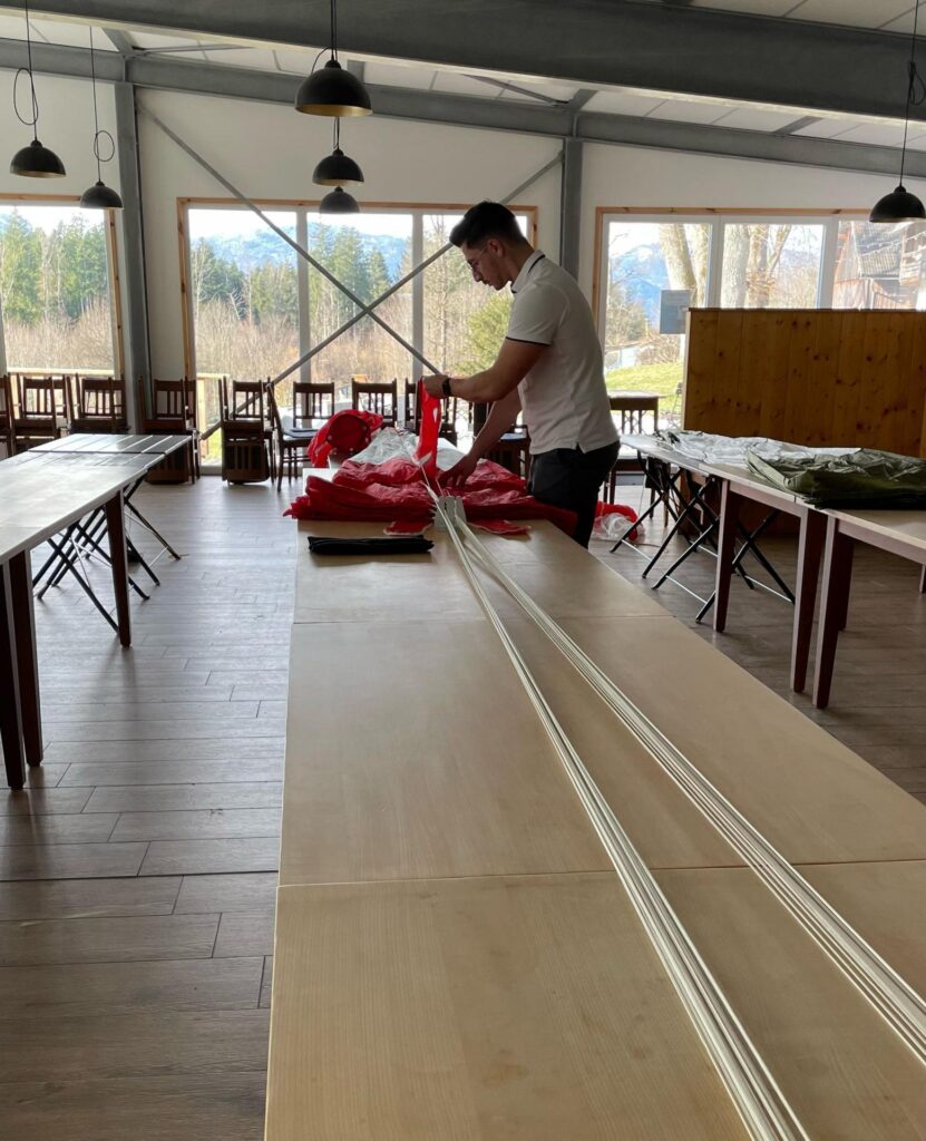 Nun zurück zu den Fallschirmwarten: Die Voraussetzung für diese Tätigkeit ist die erfolgreiche Teilnahme an einem intensiven Lehrgang, der neben theoretischen und luftrechtlichen Inhalten vor allem das korrekte Packen umfassend schult. Mit Julia Glockner und Antonio Ciadamidaro haben gleich zwei unserer Mitglieder im Februar an einem Lehrgang zum Fallschirmwart erfolgreich teilgenommen. Über drei Tage haben beide immer wieder das Packen an Rettungsfallschirmen bis zur Perfektion trainiert. Mit bestandener theoretischer und praktischer Prüfung können beide künftig unsere Fallschirmwartin Katha unterstützen, damit unsere Rettungsfallschirme rechtzeitig zum Saisonbeginn wieder gepackt und einsatzbereit sind.