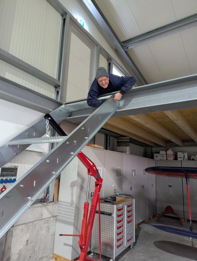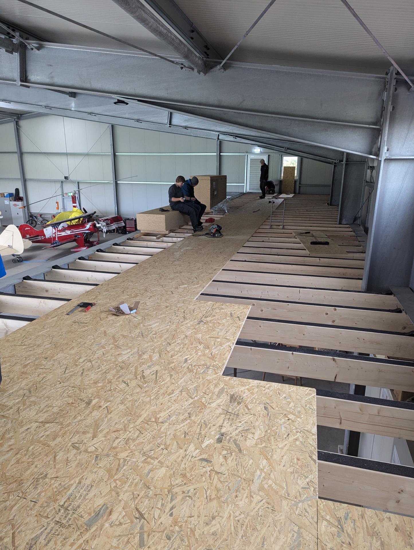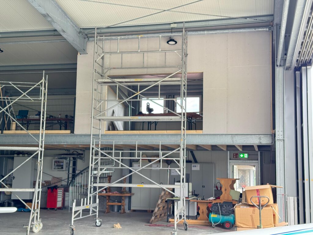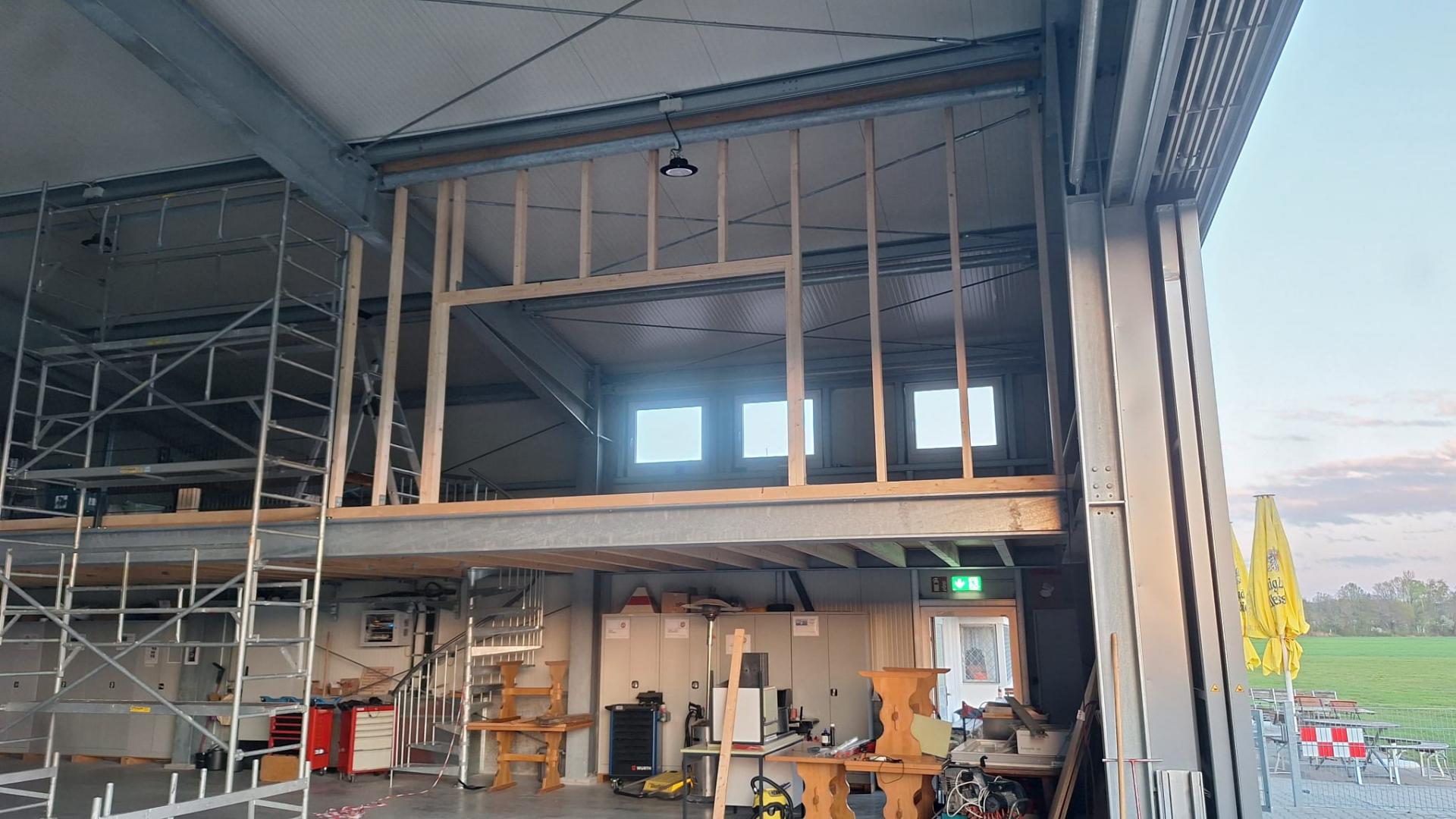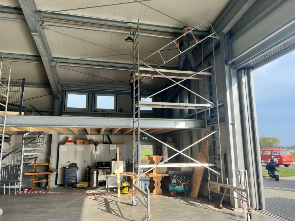 Bereits im vergangenen Herbst begannen die Arbeiten an der Empore in der neuen Halle. Dort entstehen derzeit ein Jugendraum sowie ein separater Raum zur Flugvorbereitung. Bislang diente dafür unser „Stammtischzimmer“ im Vereinsheim. Künftig gibt es also mehr Platz für konzentrierte Vorbereitung – und auch Kartenmaterial, Bordbücher, Funkgeräte und PCs können nun sicher und hochwassergeschützt gelagert werden. Auch diese Woche wurde noch einmal kräftig angepackt: Nachdem Wendeltreppe, Rettungstreppe und Geländer montiert waren, ging es an den Rahmenbau und die Rigipswände des Flugvorbereitungsraums.