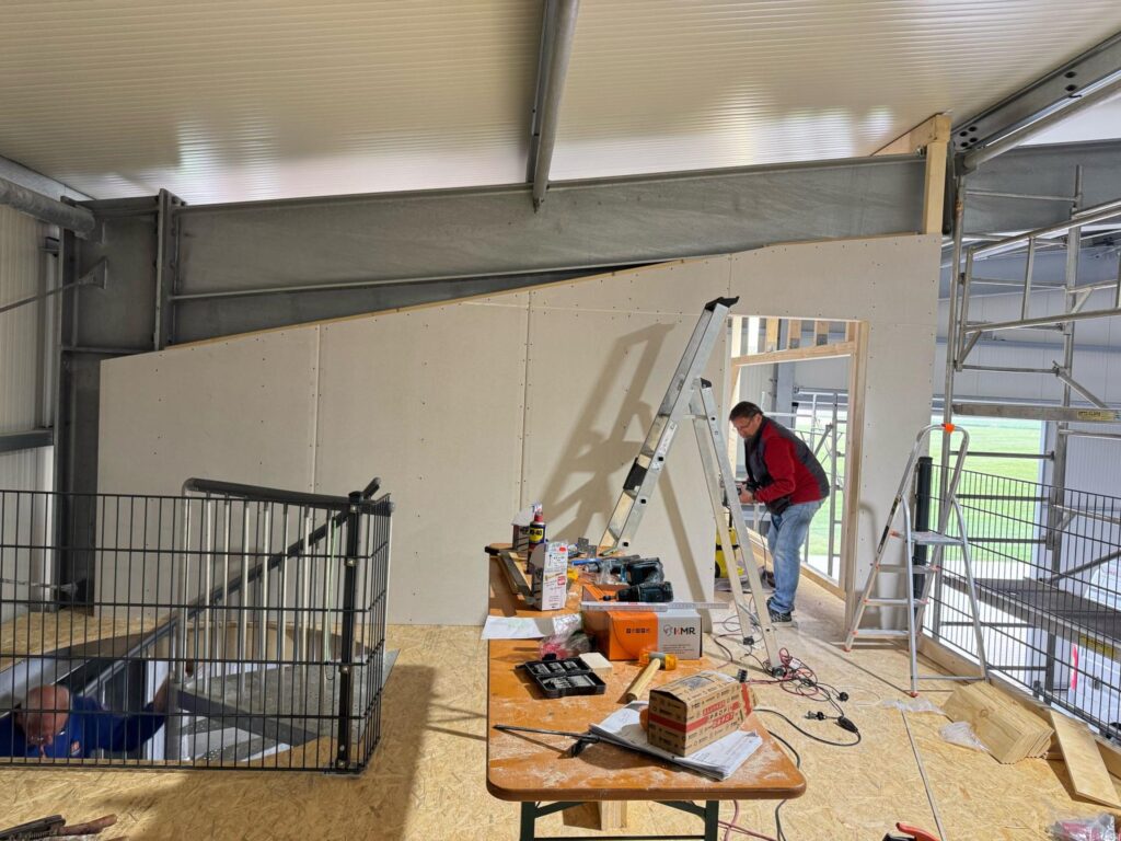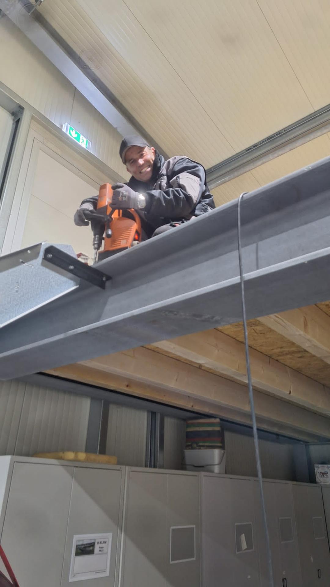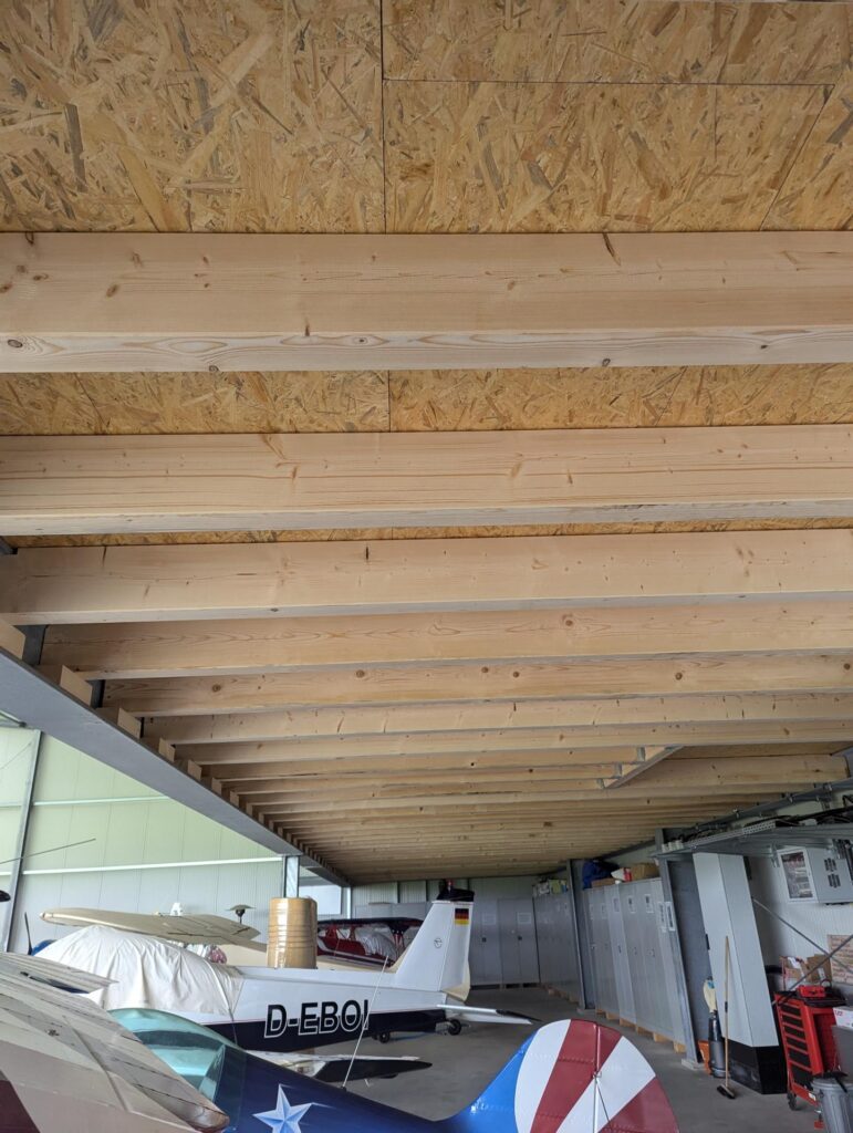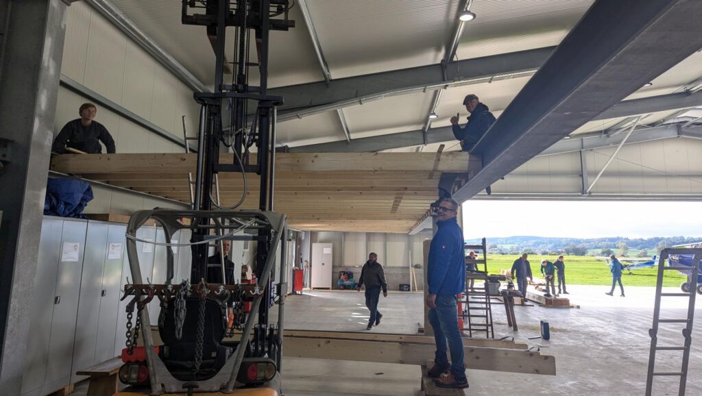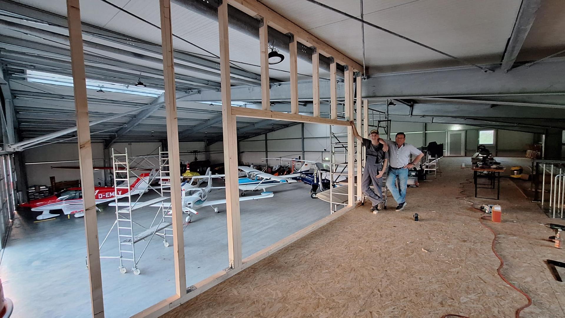 Bereits im vergangenen Herbst begannen die Arbeiten an der Empore in der neuen Halle. Dort entstehen derzeit ein Jugendraum sowie ein separater Raum zur Flugvorbereitung. Bislang diente dafür unser „Stammtischzimmer“ im Vereinsheim. Künftig gibt es also mehr Platz für konzentrierte Vorbereitung – und auch Kartenmaterial, Bordbücher, Funkgeräte und PCs können nun sicher und hochwassergeschützt gelagert werden. Auch diese Woche wurde noch einmal kräftig angepackt: Nachdem Wendeltreppe, Rettungstreppe und Geländer montiert waren, ging es an den Rahmenbau und die Rigipswände des Flugvorbereitungsraums.