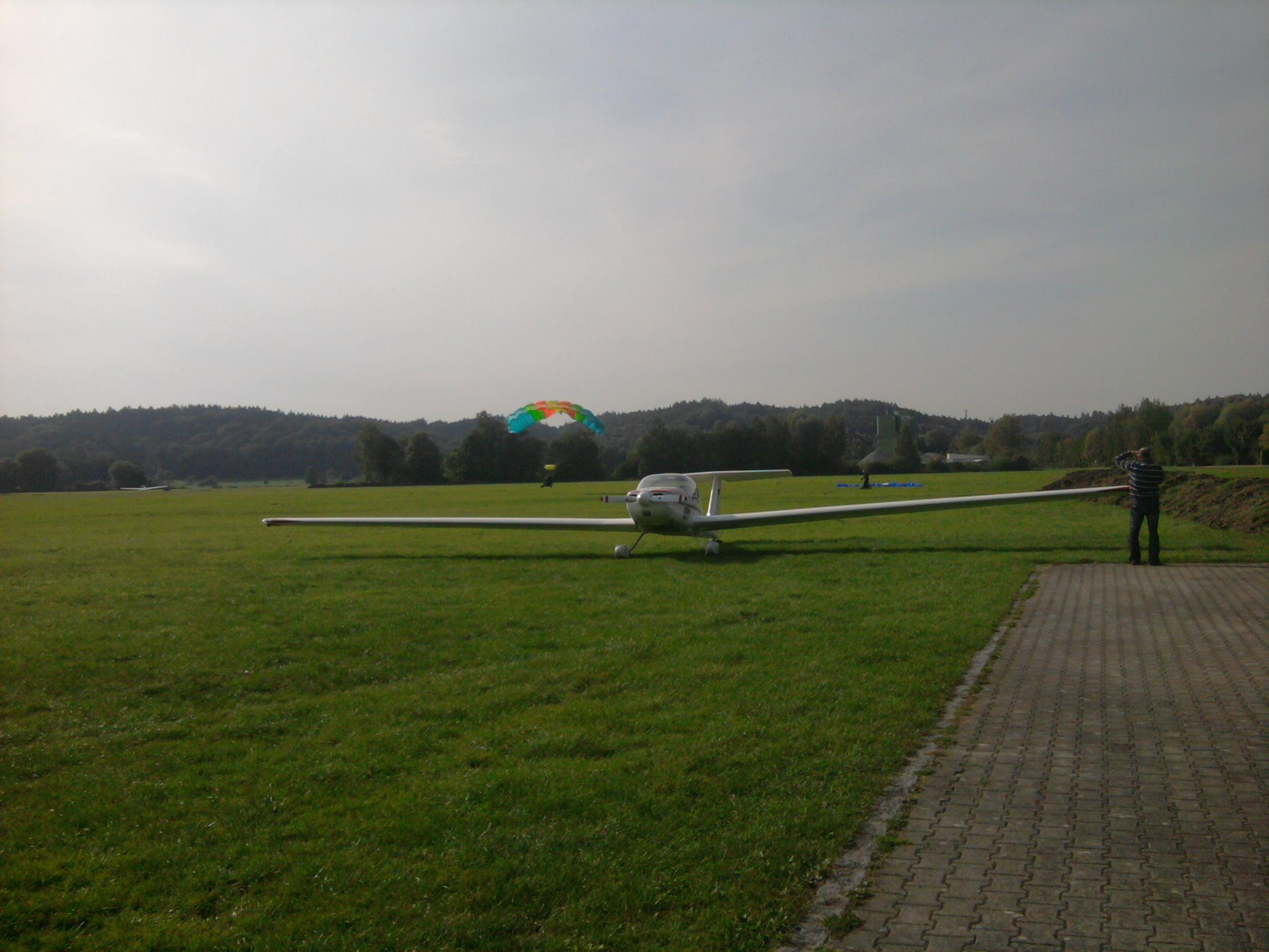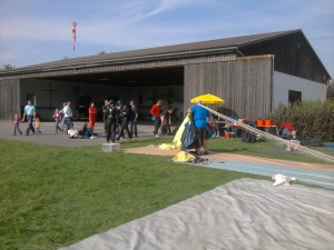 Am Sonntag, den 23. September, durften die zahlreichen Besucher einen besonders sehenswerten „Flugbetrieb“ beobachten. The Flying Bones, eine Fallschirmspringergruppe aus Tannheim waren auf Einladung des Mittelschwäbischen Luftsportvereins zu Gast in Thannhausen. Neben Solo- und Demonstrationssprüngen konnten sie den Zuschauern auch Einblick in den Fallschirmsport gewähren. Es fanden sich aber auch einige Zuschauer, denen der Blick von unten nicht ganz reichte. Sie konnten zusammen mit erfahrenen Springern, Tandem-Master genannt, beim Fallschirm-Tandemsprung das Ganze live miterleben. Fest verbunden mit dem Tandem-Master „fällt“ man frei wie ein Vogel mit Tempo 200 der Erde entgegen, bis sich der Fallschirm sanft und sicher öffnet. Der Absprung, auch „Exit“ genannt, ist wohl das aufregendste Erlebnis überhaupt. Dieses Gefühl der absoluten Freiheit und Schwerlosigkeit ist mit Worten nicht zu beschreiben. Man beschleunigt auf über 50 m/sec. und taucht in den blauen Himmel ein. In 1.500 Metern beziehungsweise nach 50 Sekunden wird der Fallschirm geöffnet, wobei der Flug dann noch vier bis sechs Minuten weitergeht. Nach der Schirmöffnung erwarteten die Teilnehmer die ganz großen Gefühle. Wie im Rausch lassen sich die folgenden Minuten am Schirm genießen.