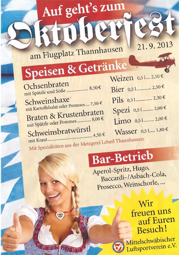 Am Samstag, 21. September ab 18:30 Uhr steigt bei uns am Flugplatz Thannhausen ein zünftiger bayrischer Abend mit Party-Stimmung und Bar&Bewirtung für’s leibliche Wohl. Musikalisch werden die Allgäuer AlpinCats einheizen.