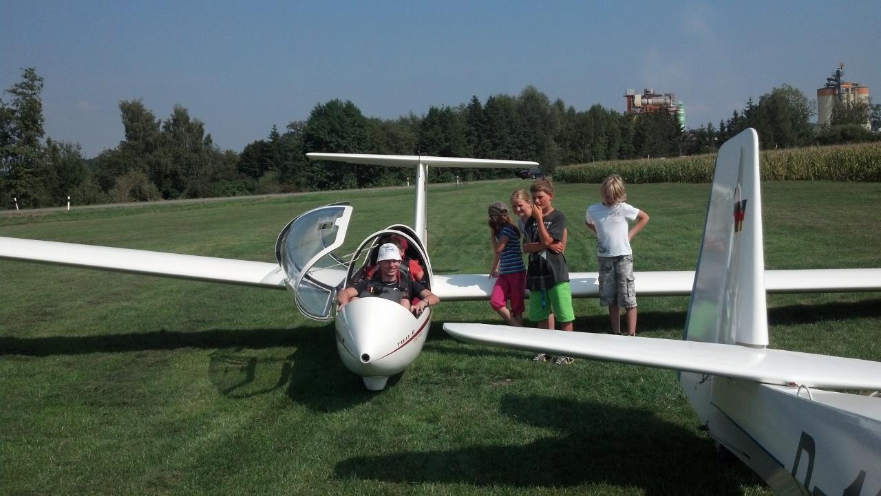 Am darauf folgenden Sonntag hatte die Abteilung Segelflug die Gruppe „Villa Kunterbunt“ der Kinder-, Jugend- und Familienhilfe Hochzoll zu einem besonderen Ausflug eingeladen. Vereinsmitglied Matthias Corbell hatte sich während einem Freiwilligen Sozialem Jahr im Kinderheim engagiert und als Abschiedsgeschenk stellte er den Kindern (und auch den Betreuerinnen) sein Hobby vor. Auch hier durften alle zehn Kinder im Doppelsitzer mit Matthias selbst am Steuer einmal mitfliegen und selbst erfahren, woher seine Begeisterung für den Flugsport herrührt. Zwar hatten einige der jungen Passagiere vor ihrem allerersten Start in einem Flugzeug ein klein wenig Angst, doch spätestens ein paar Sekunden nach dem Start war alles vergessen und sie wären am liebsten für einen zweiten und dritten Flug noch länger sitzen geblieben.