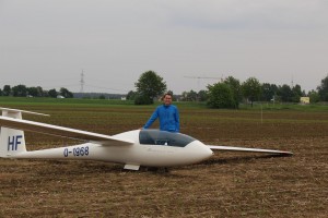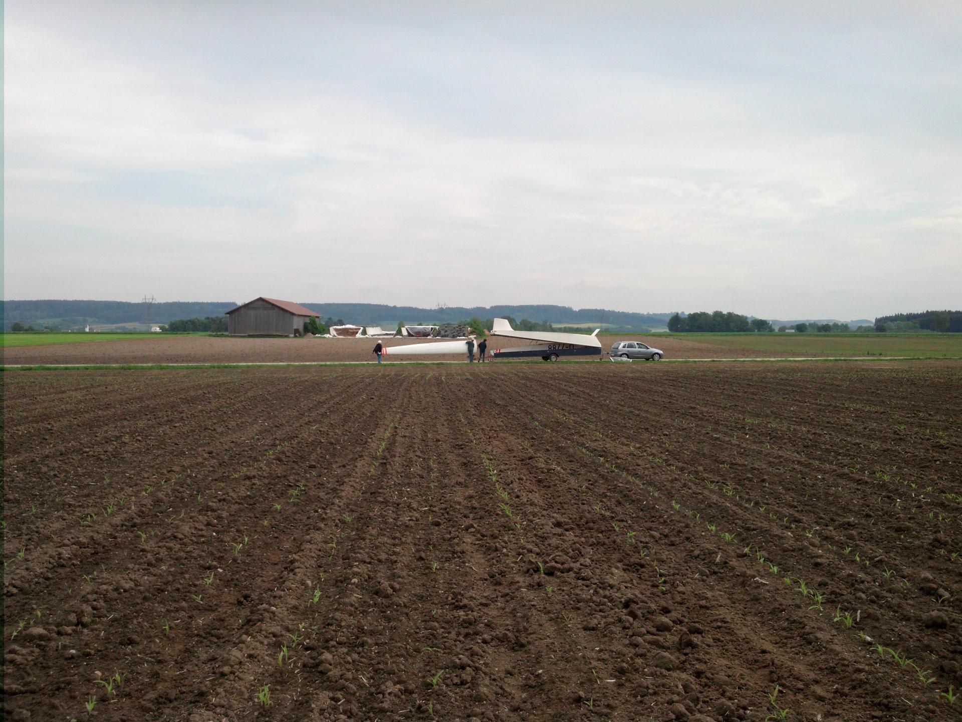 So dauerte es nicht lange, bis beim Abteilungsleiter das Handy klingelte: Florian, der mit dem Astir als erstes los flog, musste etwas nördlich des Flugplatzes außenlanden. Er hatte zwar bereits umgekehrt und den Rückflug begonnen, ihm fehlte aber die notwendige Flughöhe, um Thannhausen noch sicher erreichen zu können. Wie in der Ausbildung gelernt, wählte er sich also eine geeignete Landefläche, in seinem Fall ein Acker in der nähe von Kemnat.