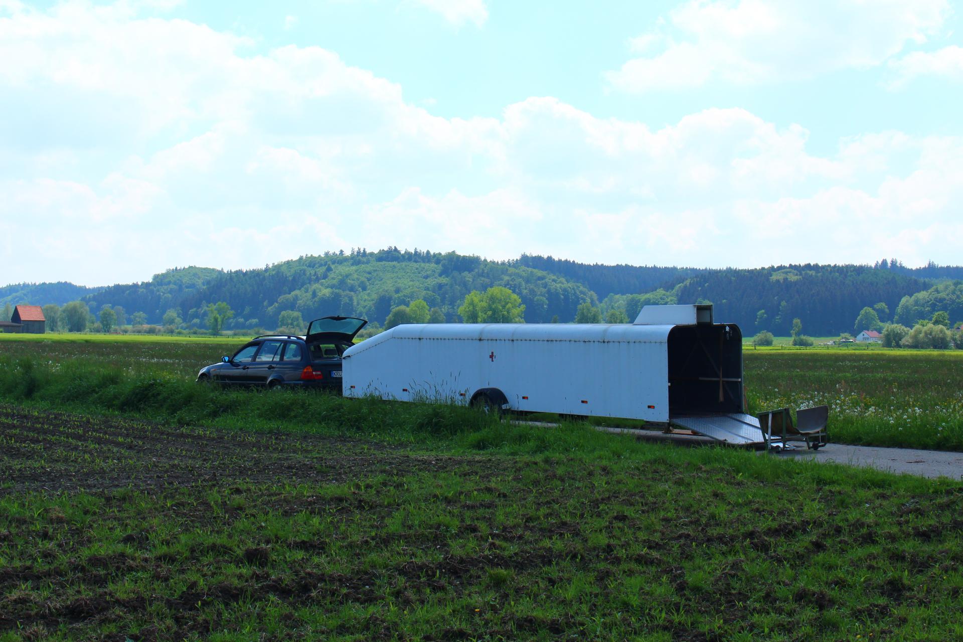Gerade während die Vorbereitungen zur Abfahrt zu Markus laufen und die Hoffnung steigt, dass Klaus es noch Heim schafft oder zumindest zu einem anderen Flugplatz, klingelt das Handy zum dritten mal. Auch er hat sich einen Acker bei Dinkelscherben „näher angeschaut“, schaffte aber immerhin einen Streckenflug von 129 km (Hier geht es zum OLC Eintrag des Fluges). Der Segelflugbetrieb wurde mittlerweile beendet und mit voller Mannschaftsstärke fahren nun zwei Gruppen los, die eine nach Günzburg, die andere nach Dinkelscherben. Bei beiden haben sich mittlerweile auch schon einige interessierte Spazierengeher eingefunden, die den wartenden Piloten die Zeit etwas vertrieben haben.