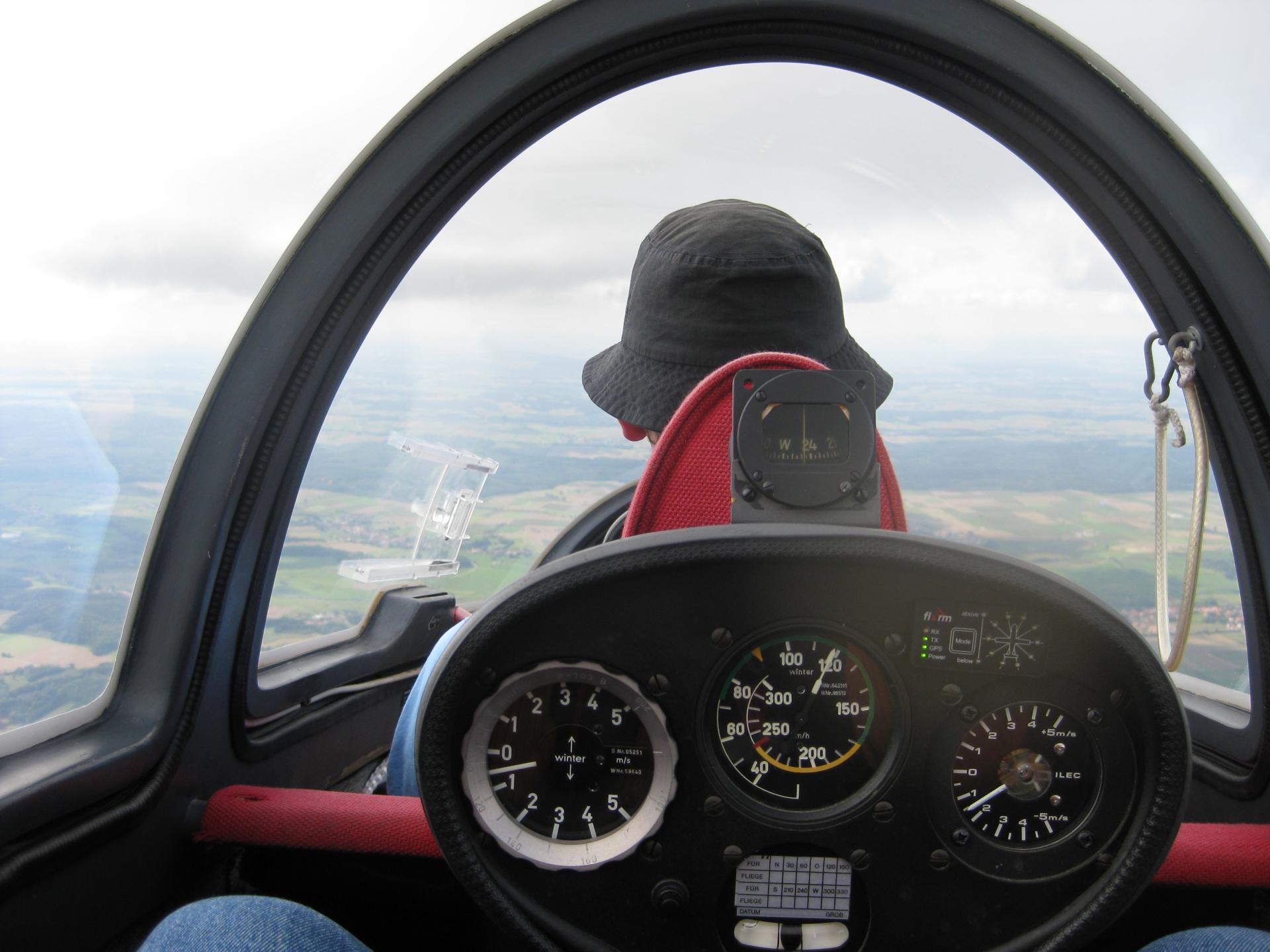 Nun sollte es zügig weitergehen mit der Vorausbildung im eigenen Verein. Dabei sollen sich die Fluglehreranwärter an das Fliegen vom hinteren Sitz im Doppelsitzer gewöhnen. Vorne, auf dem Pilotensitz, nimmt der Fluglehrer platz. Irgendwie ist das ein schräges Bild, denn auch die Flugschüler grinsen zu uns herüber. Zwanzig dieser Flüge müssen spätestens bis zum Beginn des Praxislehrgang durchgeführt werden, davon mindestens drei mit einem Gruppenfluglehrer, der dann die praktische Vorauswahlprüfung abnimmt. Beim MLV habe ich im April und Mai immerhin acht solche Flüge mit Bergfalke und Twin absolviert. Eine etwas andere Perspektive, wenn plötzlich ein Kopf direkt voraus die Sicht einschränkt und auch seitlich die Tragflächen den Blick nach hinten-unten versperren. Auch Start und Landung fühlen sich etwas anders an. Aber schon nach zwei bis drei Starts und Landungen mit unseren Fluglehrern Beppo und Uli habe ich die neue Situation im Griff. Wir fliegen einige der für die Schulung üblichen Manöver, wie Vollkreise, Rollübungen, hochgezogene Fahrtkurven und beenden die Flüge mit (Kurven)-Slips bzw. Anflügen aus ungewohnten Positionen. Alles klappt soweit, die praktische Vorauswahlprüfung kann kommen.