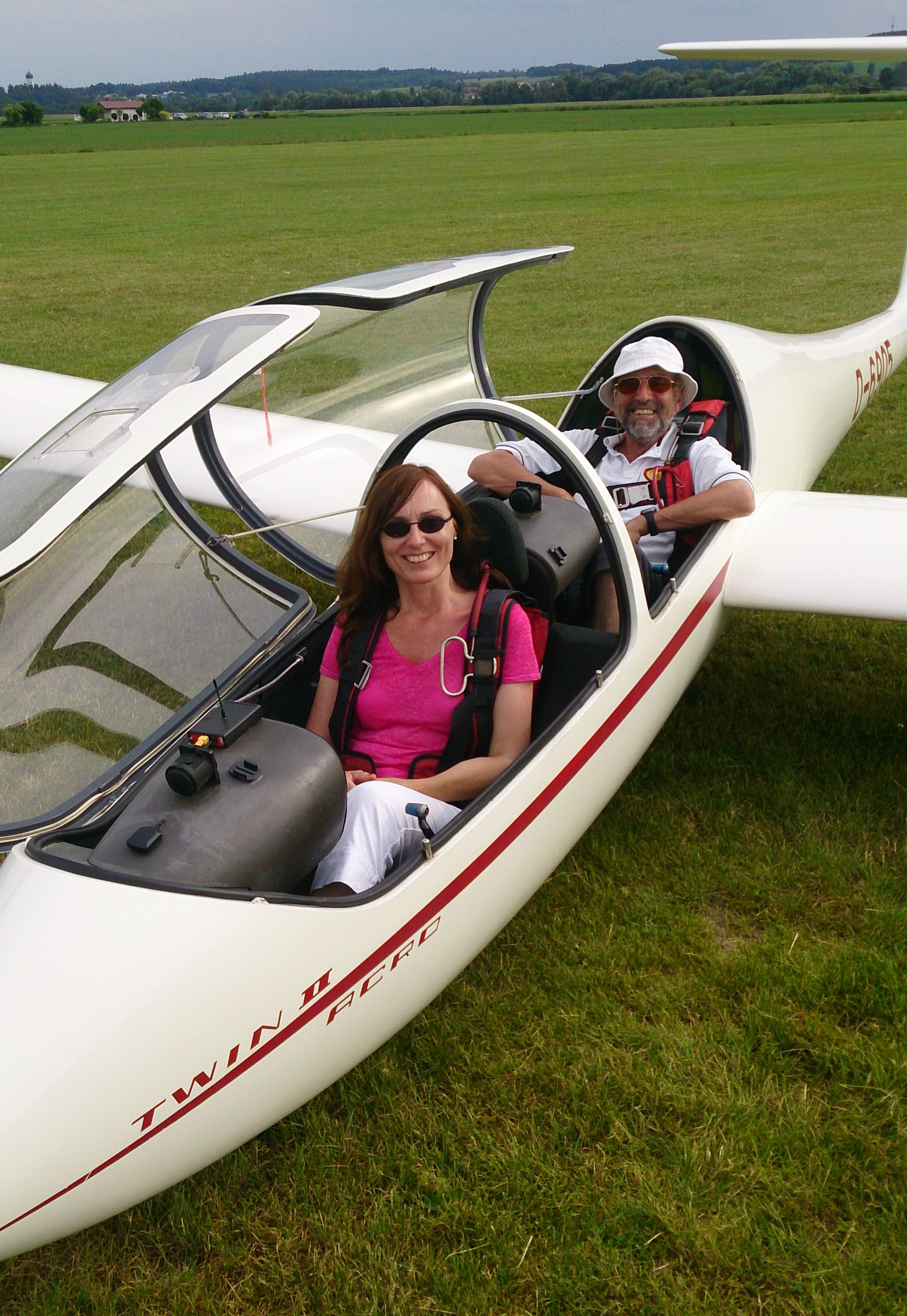 Schon letztes Jahr hatte Fluglehrer und Schullehrer i. R. Ulrich Wurm seine Kollegin Claudia Mey vom Asam Gymnasium München mit ihrer Klasse zum Schnuppern (siehe Beitrag von 2014) eingeladen. Die Schüler konnten zusammen mit Uli und den Piloten des MLV dann selbst einmal einige Flüge im Segelflugzeug miterleben. Damit der Bus für die Rückfahrt noch rechtzeitig erreicht werden konnte, hatte damals Physik und Mathematik Lehrerin Claudia Mey auf ihre eigenen Flüge verzichtet. Das sollte nun dieses Jahr nachgeholt werden, auch Katrin Braunmüller, eine weitere Kollegin folgte der Einladung nach Thannhausen. Am vergangenen Samstag war es dann soweit, zusammen mit den Flugschülern und Uli, konnten Claudia und Katrin einen zwar heißen, aber schönen Flugtag miterleben. Dank guter Blauthermik waren auch längere Flüge möglich. Claudia Mey hatte schon vor einigen Jahren in den Segelflug hinein geschnuppert und hatte das Händchen für’s Fliegen behalten. Selbständig konnte sie mit viel Gefühl und Talent die Thermik zentrieren und bis auf 2400 Meter über dem Meeresspiegel steigen. Nach einer Stunde ging es dann wieder zurück zur Landung.