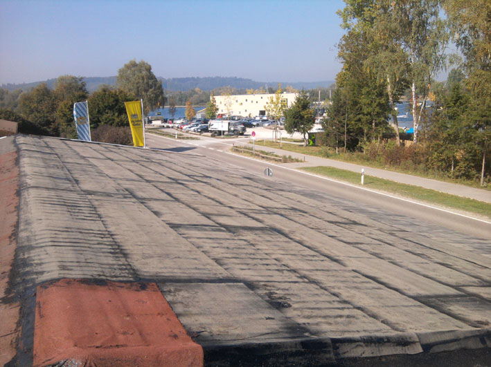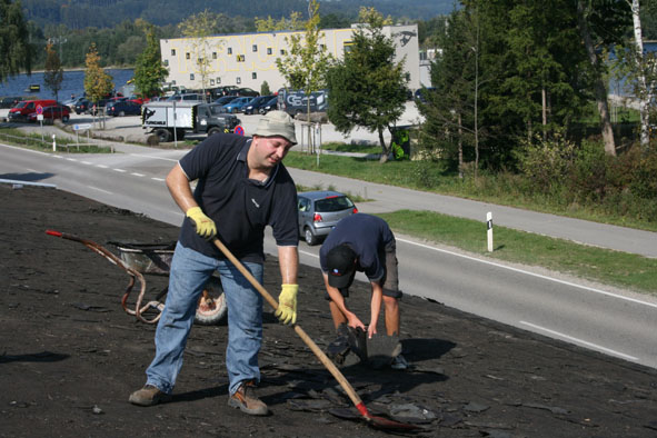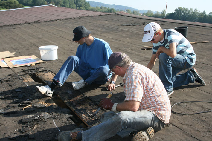 Dies allerdings brachte den Zeitplan heftig durcheinander, man bekam zwar am Samstag das Dach wieder zu und zwei Reihen der Schweißbahnen konnten noch verlegt werden, aber fertig wurde es trotz großer Beteiligung an den Arbeiten nun nicht mehr. Auch Franz Endres ehemaliger aktiver UL Pilot konnte durch seine Mithilfe den Fortgang der Arbeiten nicht so beschleunigen, dass man hätte noch fertig werden können. Die Wettervorhersage hielt was die Meteorologen versprachen.So konnten in der fologenden Woche alle notwendigen Arbeiten erledigt werden, damit dann am folgenden Samstag der Rest des Daches wieder Dicht gemacht werden konnte.