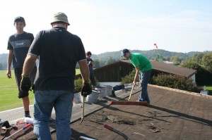 Das große Thema der Überlegungen beim MLV ist derzeit der Hochwasserschutz. Hochwasser ist ein Wort, das die Flieger des MLV nur aus der Theorie kennen. Denn Hochwasser hat es am Flugplatz noch nie gegeben. Deshalb sind alle Überlegungen dazu eher theoretischer Natur und auch in dem vorliegenden Simulationsmodell dadurch erzeugt, dass die Mindel bei dem hochgerechneten Modell ihr Wasser dann über die Wiesen des Mindeltals schicken soll. Ein ganz anderes Problem mit dem Wasser haben die Flieger des MLV ganz aktuell. Bei starkem Regen tropfte das Wasser durch das Dach in ihren Hangar. Deshalb stand bei den Fliegern des MLV schon seit längerem der Punkt Dachsanierung auf der Agenda. Die angekündigte Schönwetterperiode während des Oktoberfestes ließ die Aktiven des MLV nun zur Tat schreiten. Zunächst galt es die alten Schindeln vom Dach zu entfernen um dann mit neuen Schweißbahnen wieder ein dichte Abdeckung zu erhalten.