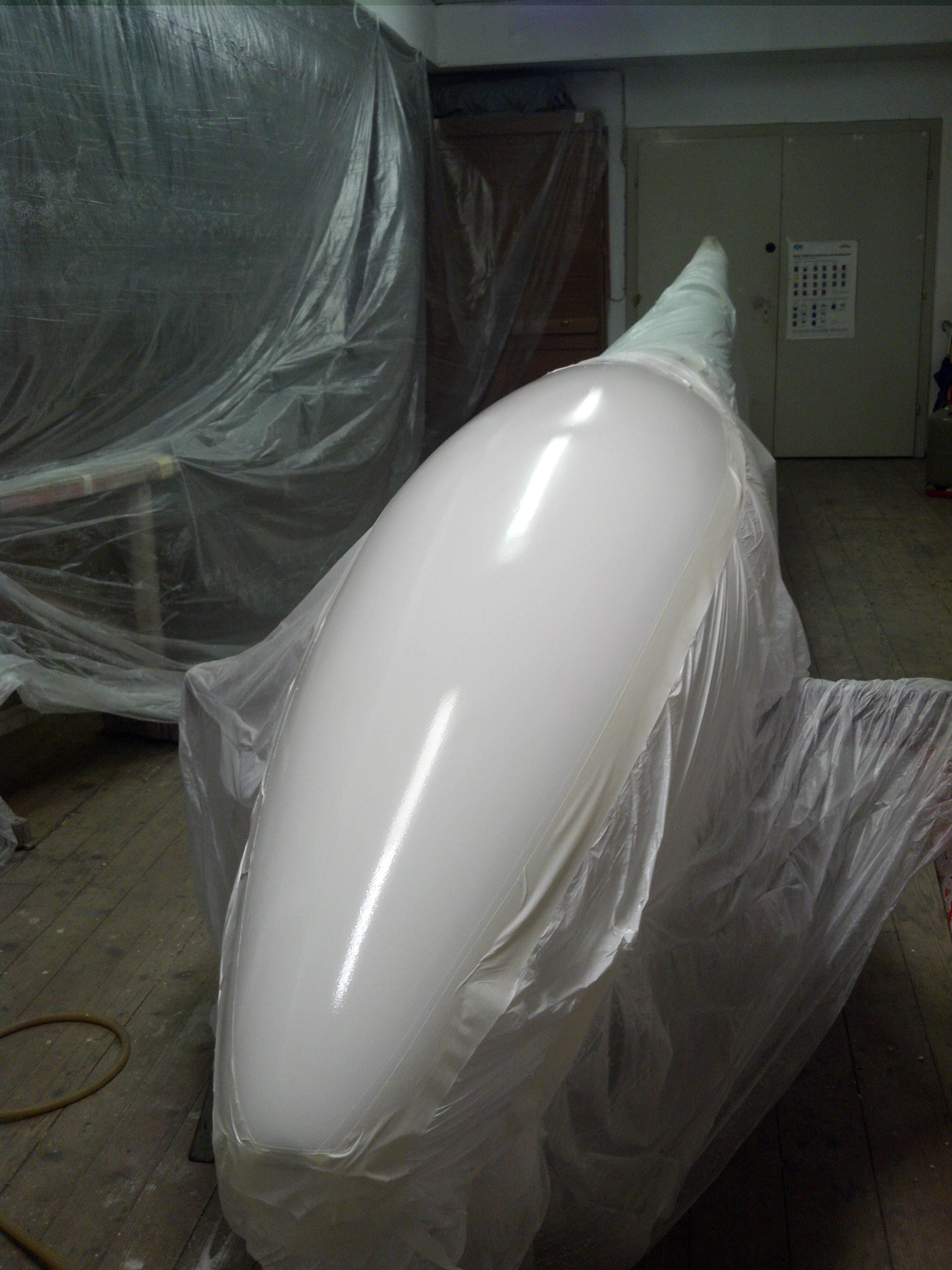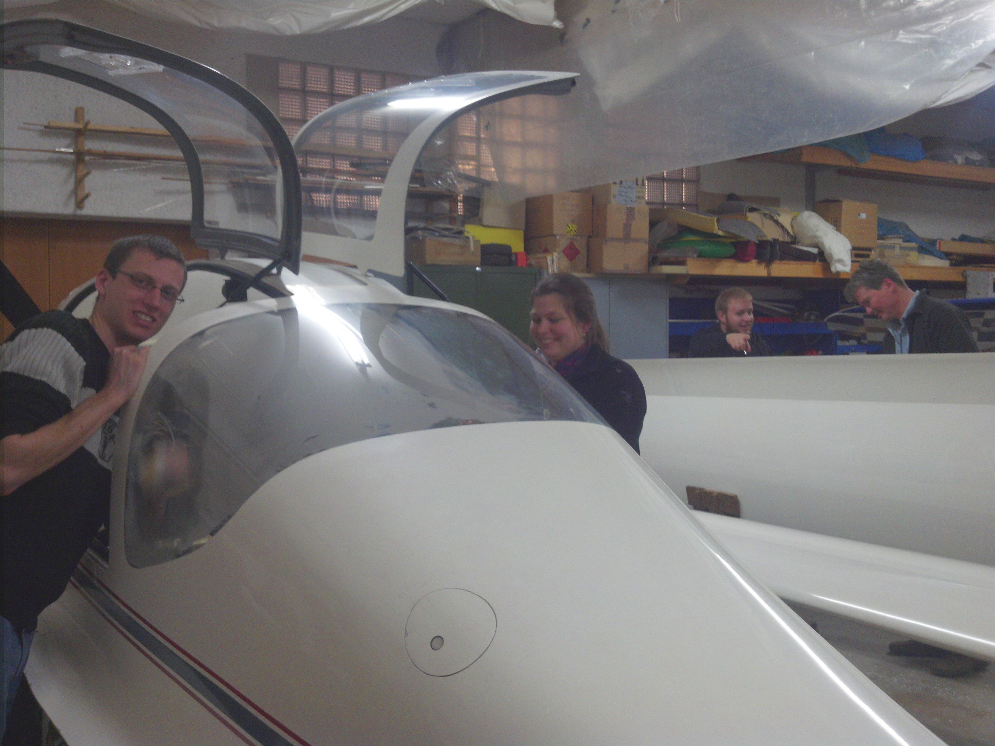 Bei einer Außenlandung im Acker hat der Rumpfboden der LS4-b einige Kratzer abbekommen. Der entsprechende Bereich wurde von Zellenwart Thorsten im Januar geschliffen, gespachtelt und schließlich neu lackiert. Das Bild wurde direkt nach den Lackierarbeiten aufgenommen. Danach wurde alle nochmals auf hochglanz geschliffen und poliert.